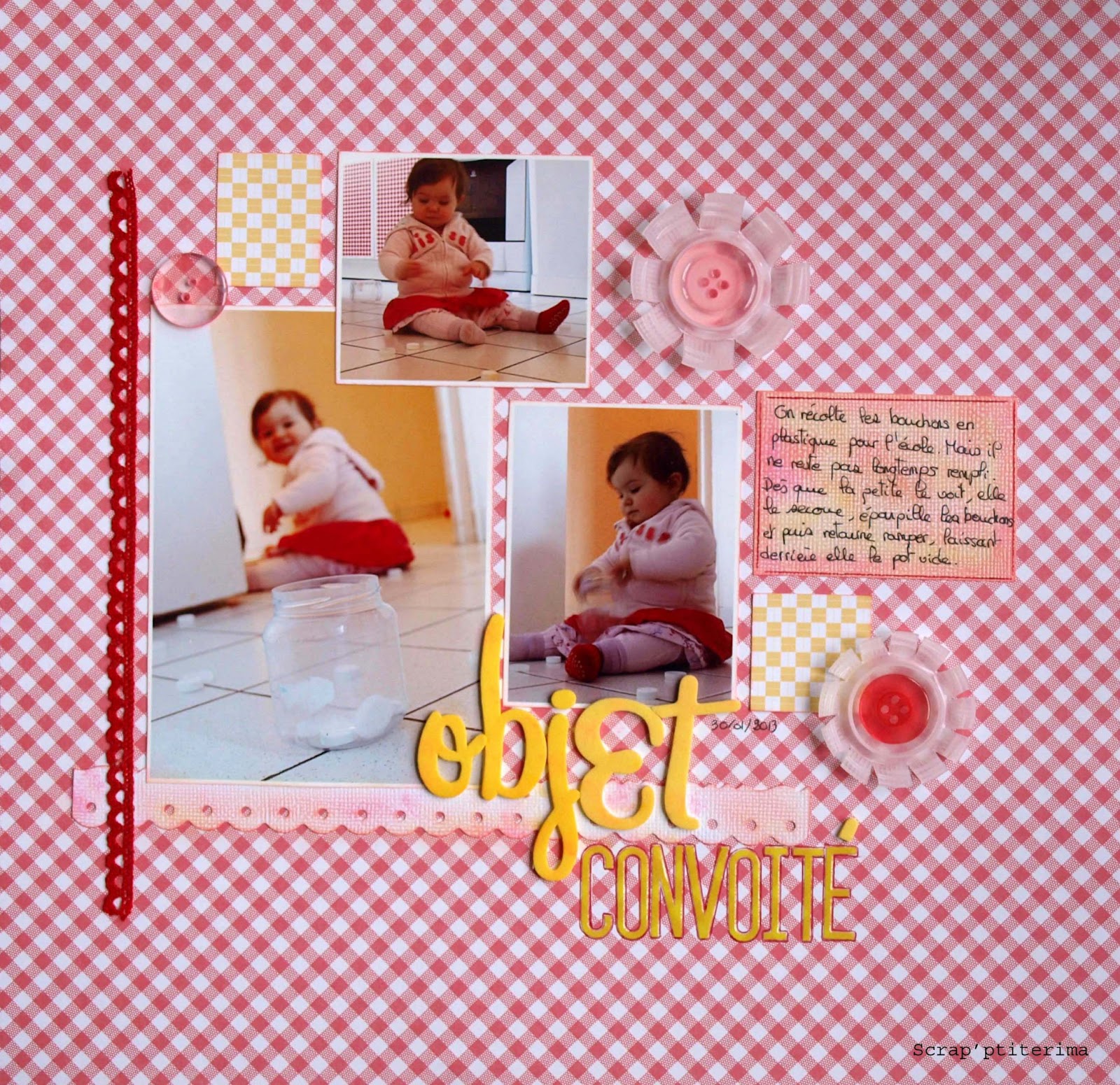 Oui, vraiment, quelle jolie page!!! L'accord parfait entre les différents carreaux, le tissu vichy qui rappelle bien les robes des petites filles, et ces bouchons transformés en fleurs, il fallait y penser! en plus, la transparence offre un résultat léger et très frais! j'adooooooooore!!!